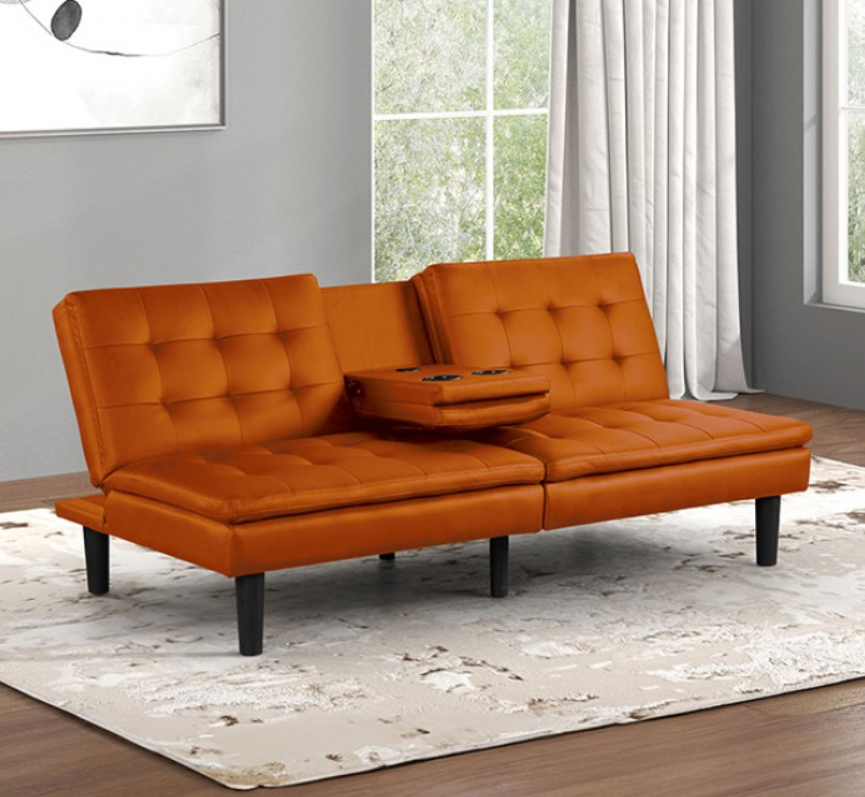 Contemporary styled futon sofa converts to a bed (Drop-down Table w/ Cup Holders, USB-A & USB-C Charger)