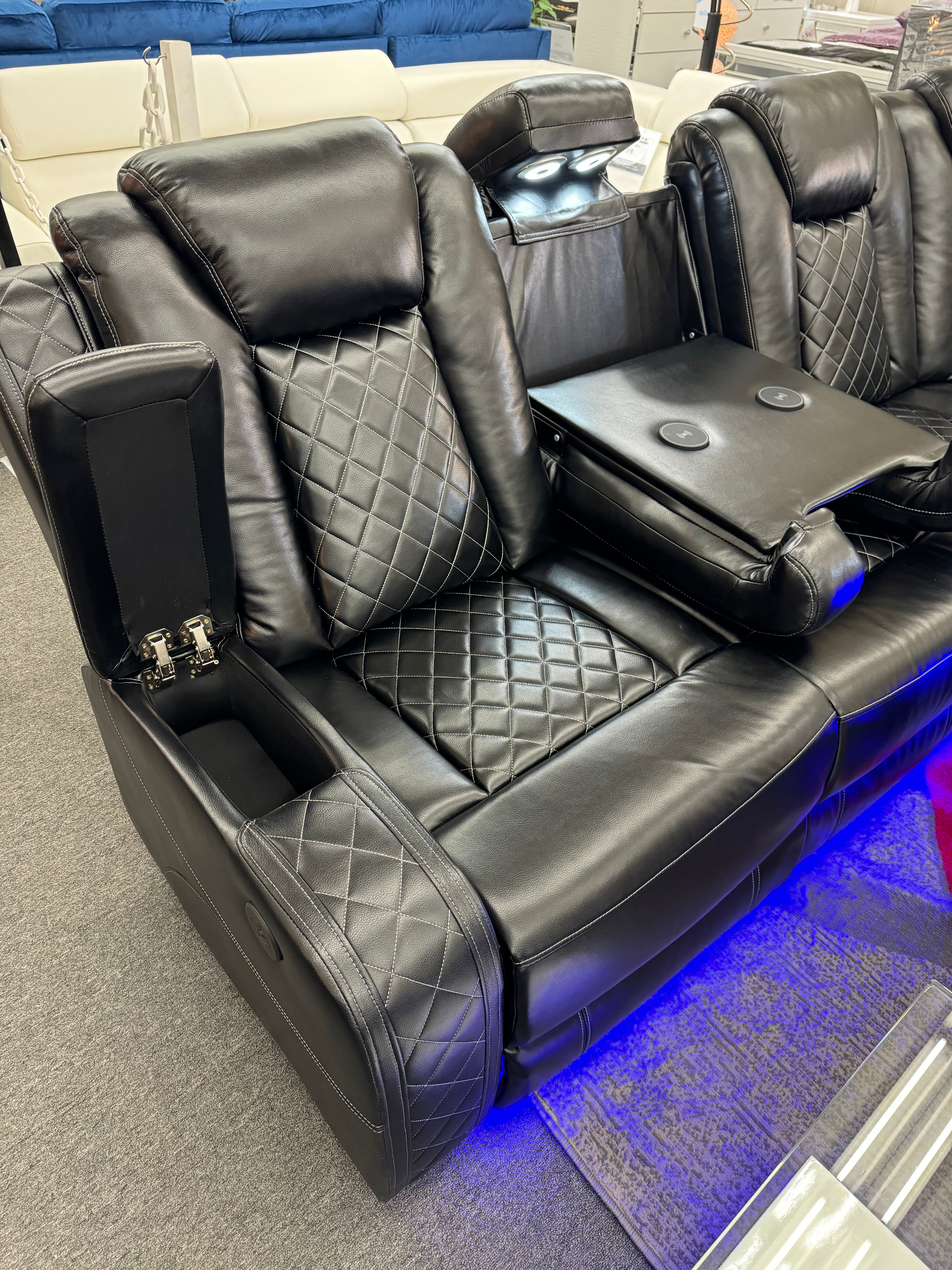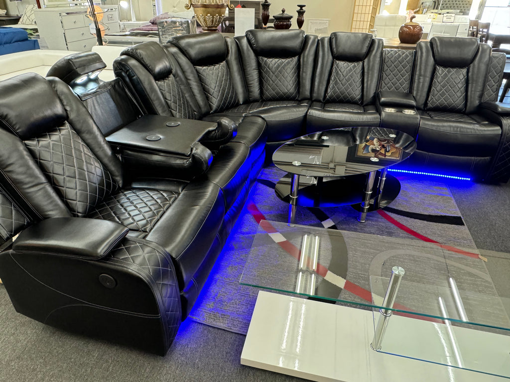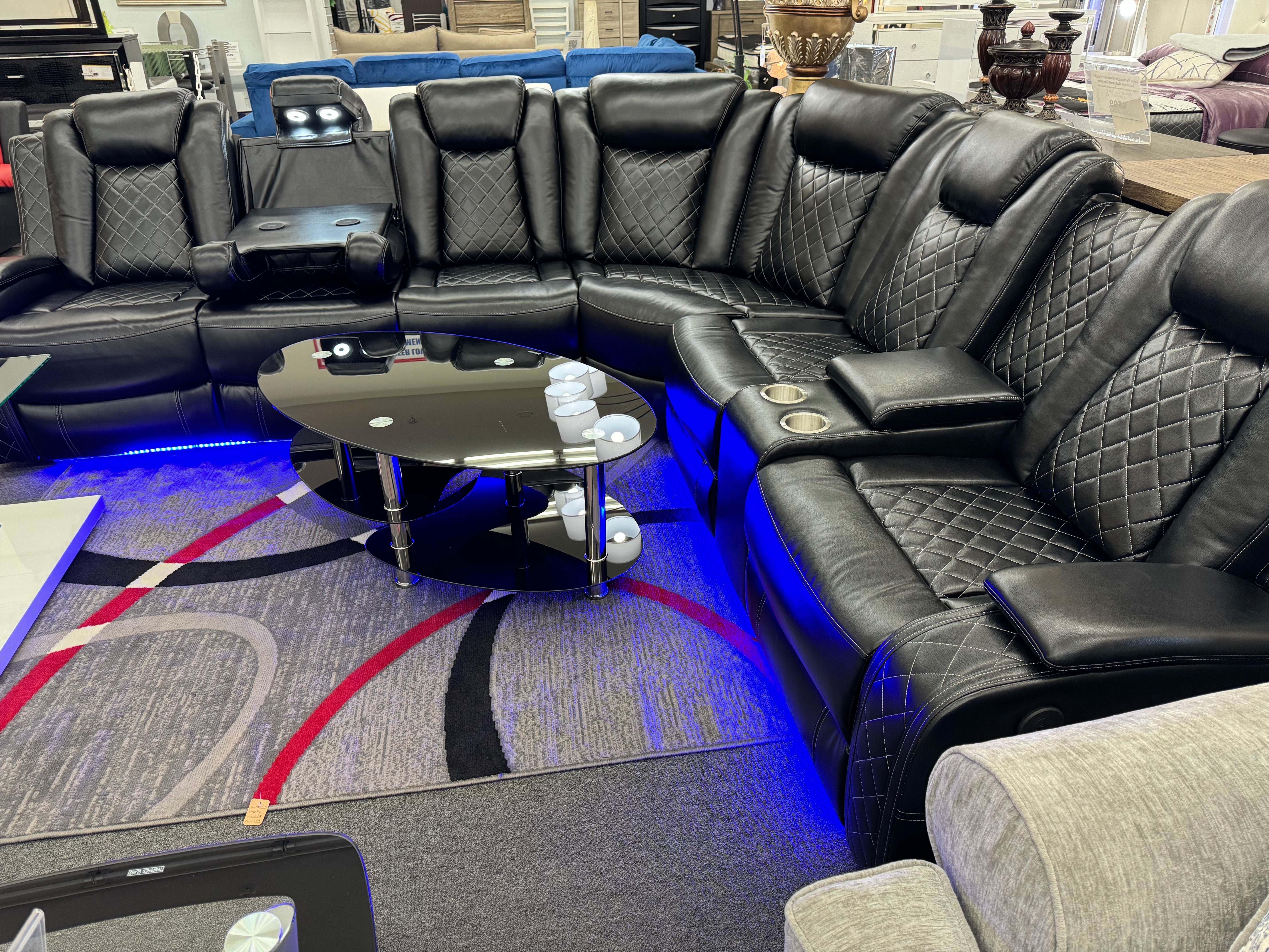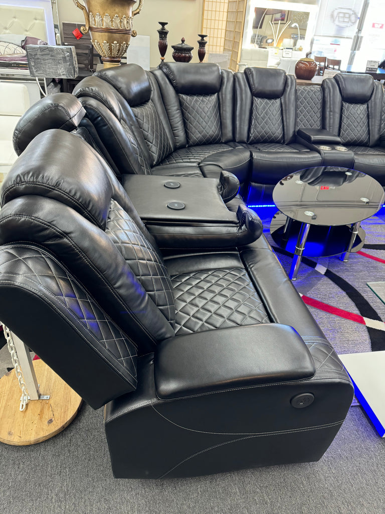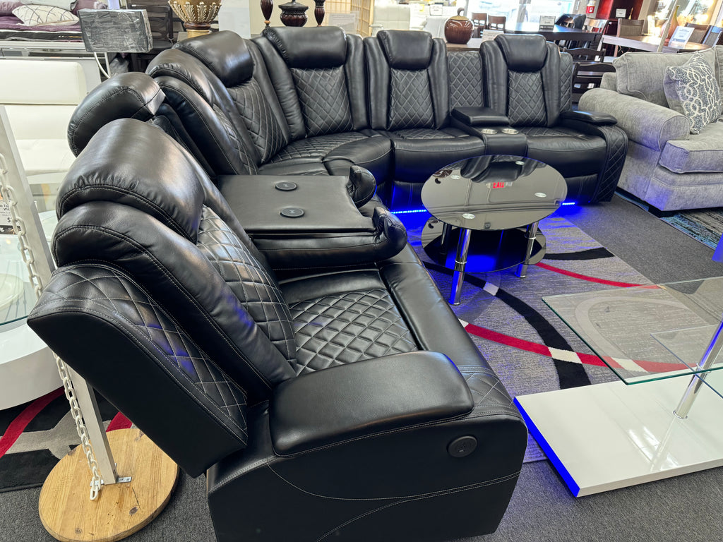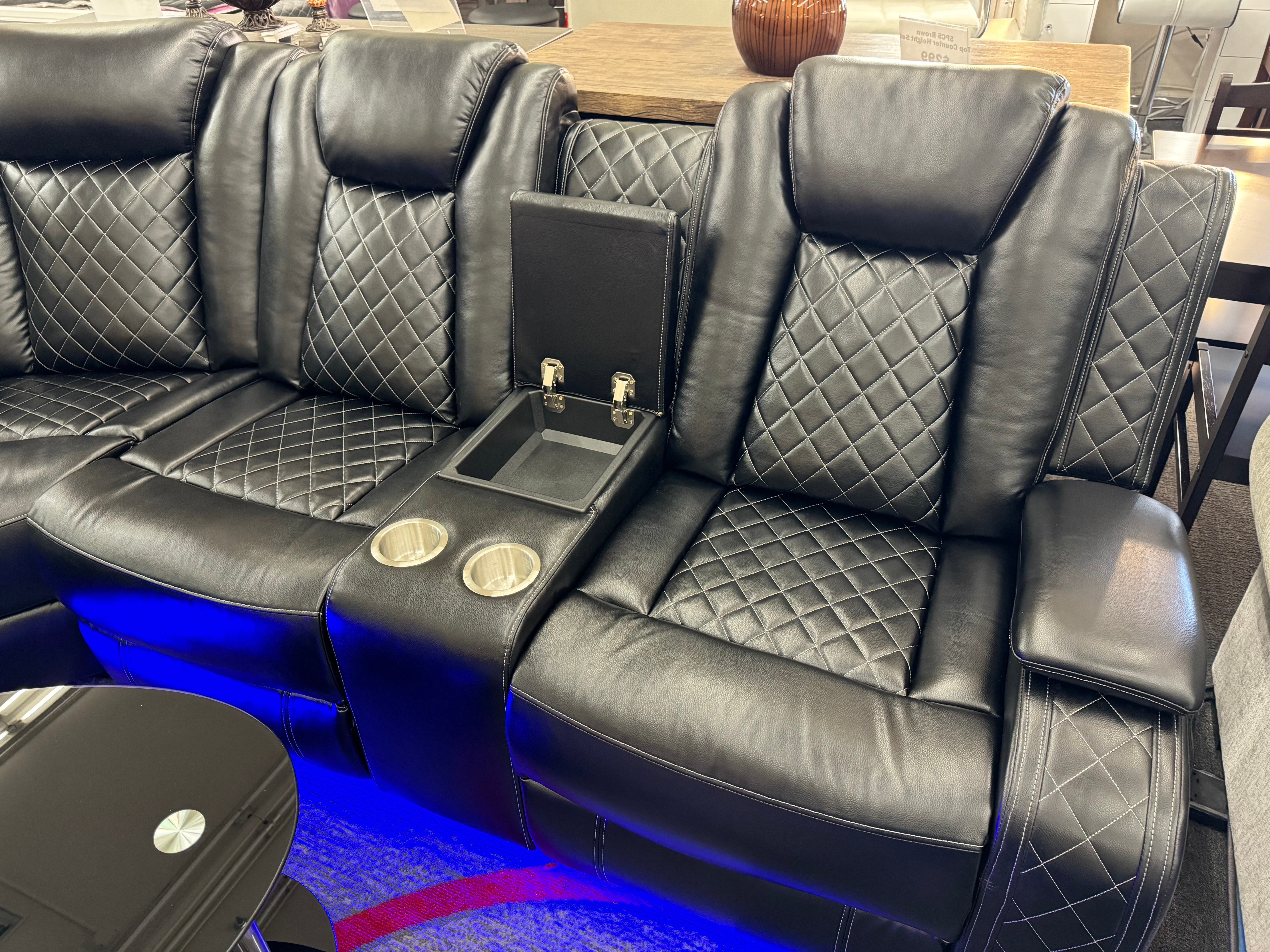 1 Black Sectional (Storage arms - Drop down - drink tray with lift up light bar - Wireless charger - Includes power headrest and footrest)