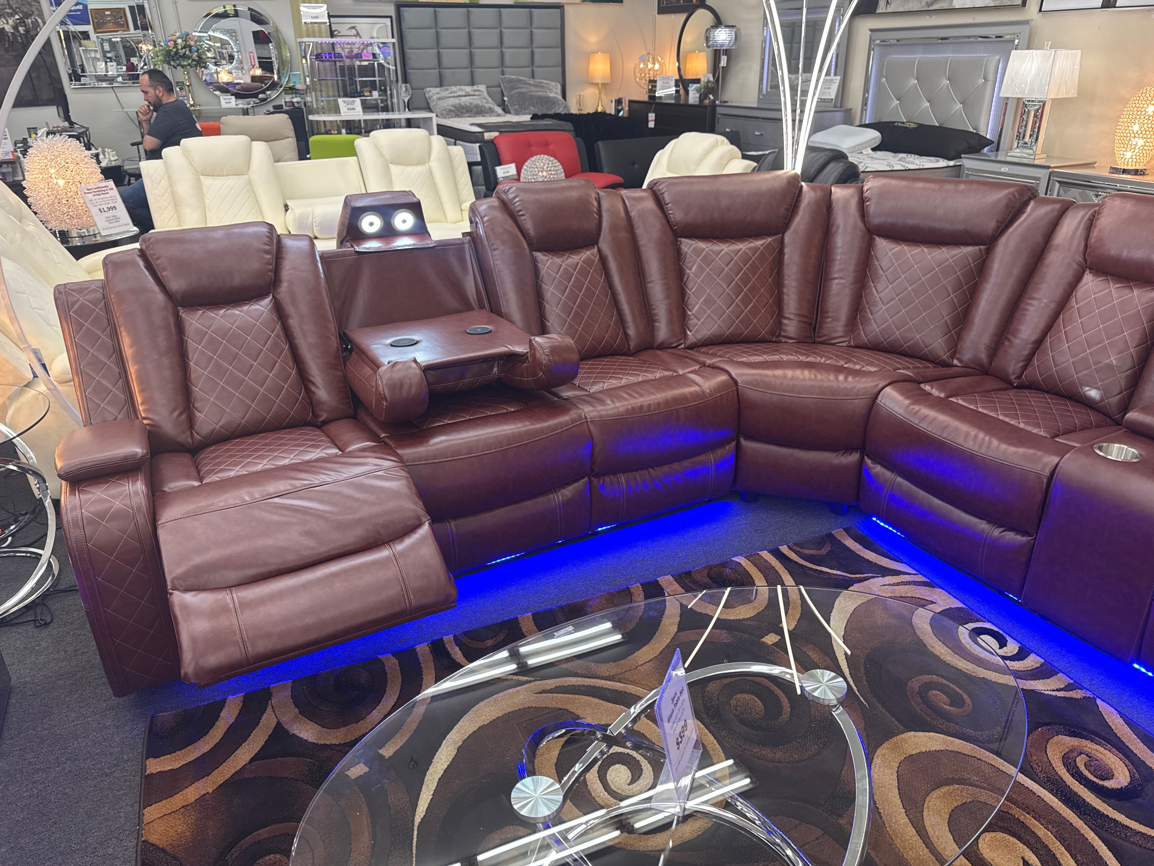 1 Brown Sectional (Storage arms - Drop down - drink tray with lift up light bar - Wireless charger - Includes power headrest and footrest)