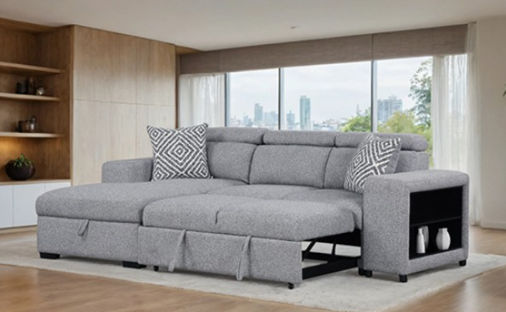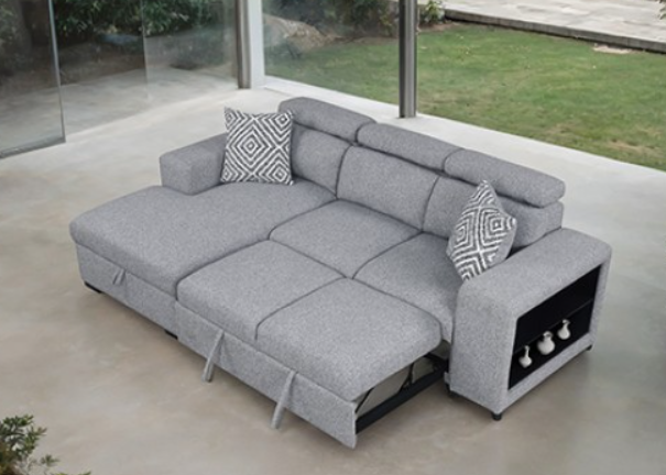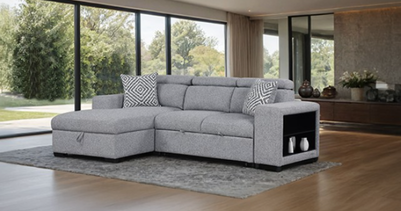 Sectional w/Chaise with Storage, Adjustable Headrest, Pull-Out Sleeper, Pillows Included, Track Arms w/ Bookcase.